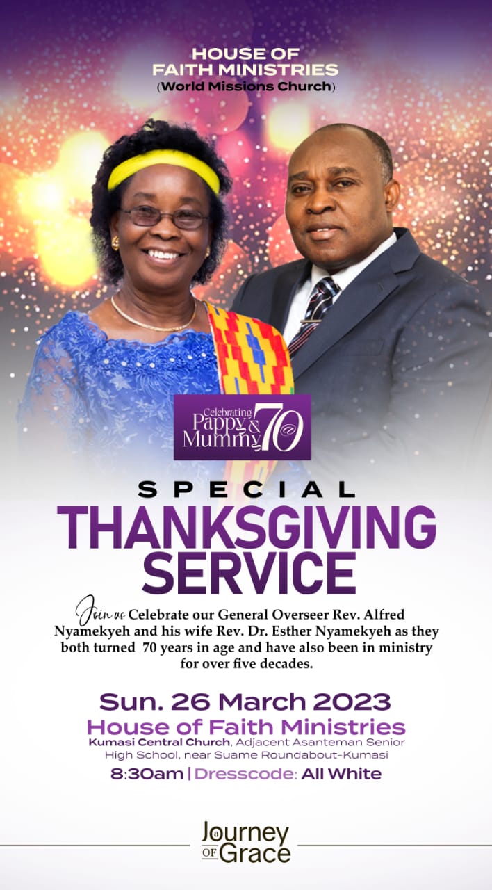 On Sunday, 26th March, 2023 there will be a Special Thanksgiving Service to celebrate Rev Alfred Nyamekyeh & Dr. Esther Nyamekyeh at the House of Faith Ministries in Kumasi.