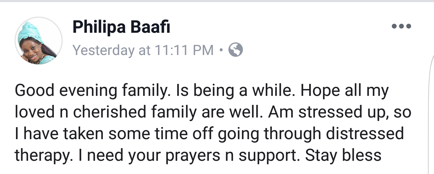 Ghanaian Gospel musician Philipa Baafi who has been missing from the music scene for a while now, has hinted that she is currently going through some stressful moments in her life.