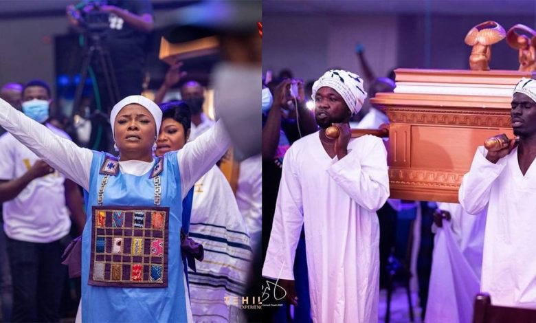 The Ghanaian gospel musician Ohemaa Mercy’s turn to minister was a sight to behold. Her entrance alone was just an incredibly epic, a moment of spiritual reminiscing characterized with a depiction of the ark of covenant of the old testament! As you know the prayerful woman and worshipper has the grace to lead the patrons to intimate each time, and she did it without fail!